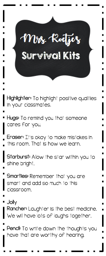 It is time to begin thinking about Open House! One of the things I do to prepare for open house night is put together "Survival Kits" for students. I grab all my items at Dollar Tree and place them in clear plastic bags and tie with ribbon. Then I place this note through the tie! Look Below.
